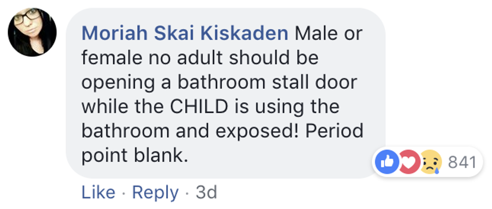 Adults forcing themselves into her stall while she used the bathroom is even more appalling.
