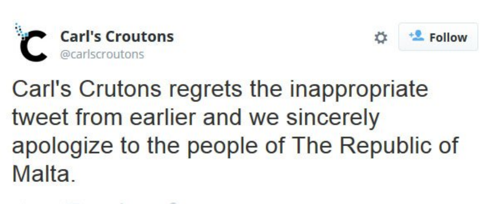 "Carl's Crutons [sic] regrets the inappropriate tweet from earlier and we sincerely apologize to the people of The Republic of Malta."